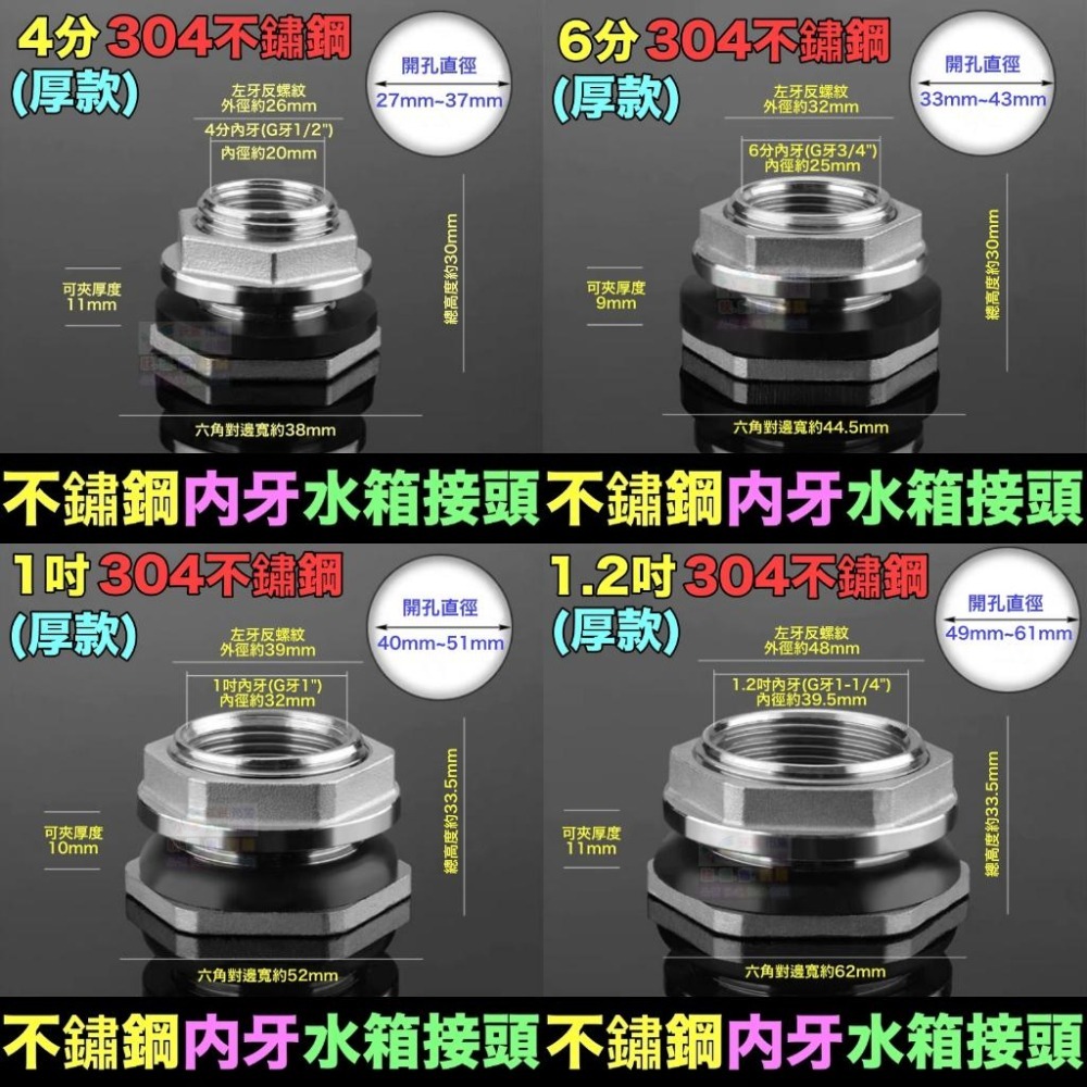 ⚠️【特別提示】:因為蝦皮各品項價差不能相差超過5倍,所以【2吋304內牙水箱接頭(厚款)】的規格,請下標2的倍數; ⚠️【2吋304內牙水箱接頭(厚款)】=400元/組,請下標2的倍數; 🚁商品規格:4分(1/2"),6分(3/4"),1吋=(1"),1.2吋=(1-1/4"),1.5吋=(1.5"),2吋=(2") 商品材質:全銅/304不鏽鋼、矽膠墊圈 適用壓力:≦3.0MPa(30kg/cm²) 適用溫度:0℃~160℃ 商品重量:(薄款)約45g/4分,約50g/6分,約55g/1吋,約85g/1.2吋,約110g/1.5吋,約130g/2吋 (厚款)約110g/4分,約155g/6分,約220g/1吋,約280g/1.2吋,約350g/1.5吋,約470g/2吋 可鎖厚度:(薄款)≦3mm/4分~2吋 (厚款)≦10mm/4分~2吋 開孔直徑:(薄款)約26~30mm/4分,約30~33mm/6分,約37~41mm/1吋,約46~50mm/1.2吋,約52~55mm/1.5吋,約64~69mm/2吋 (厚款)約27~37mm/4分,約33~43mm/6分,約40~51mm/1吋,約49~61mm/1.2吋,約55~67mm/1.5吋,約67~80mm/2吋