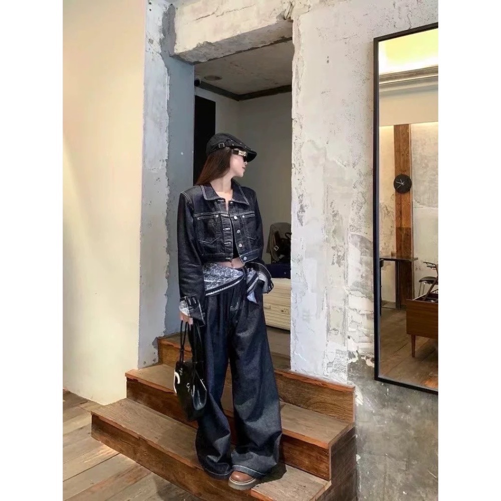 LOVEYAN➰ 2025新款秋冬款韓版休閒牛仔套裝百搭設計感牛仔外套闊腿褲兩件套