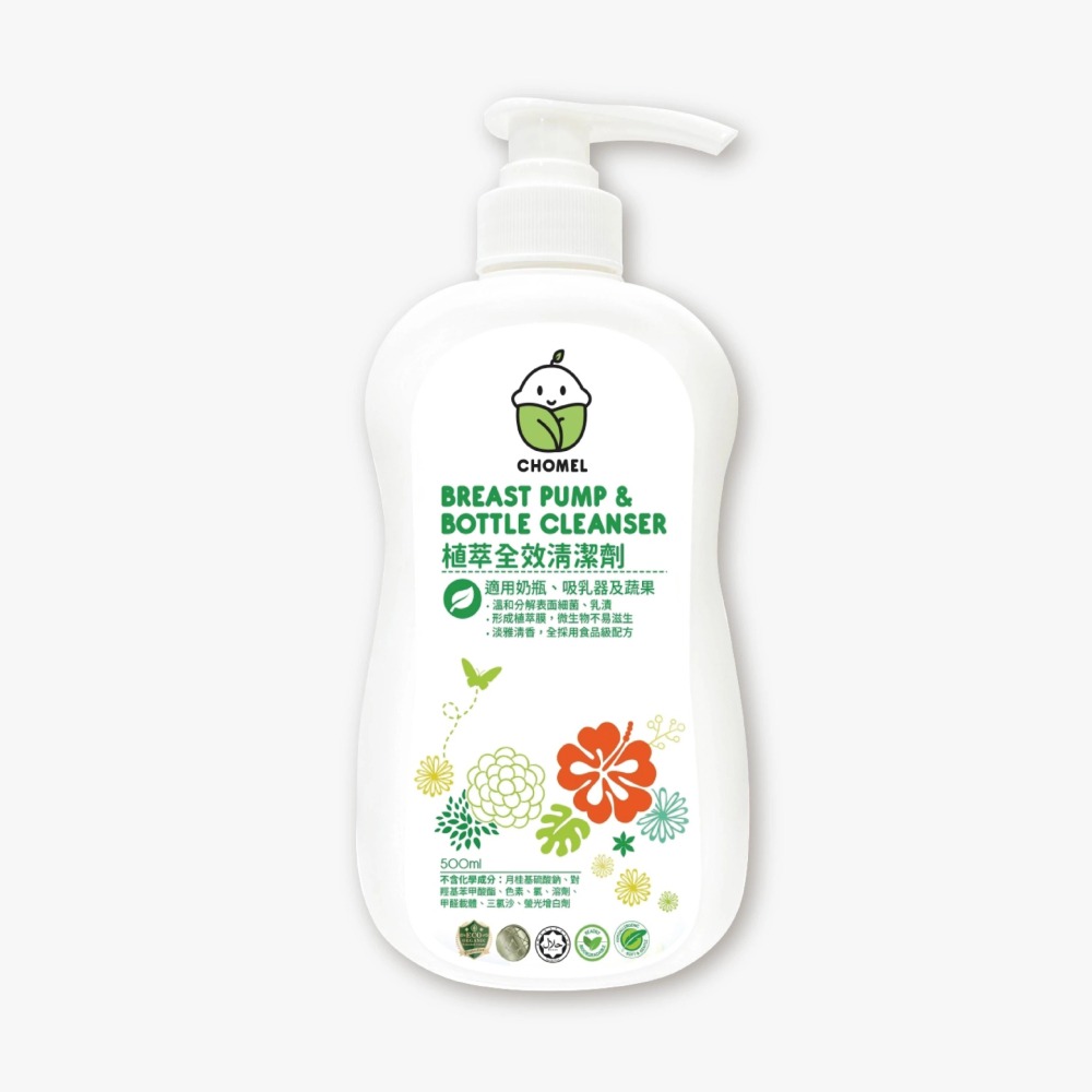 按壓適量清潔劑以海綿或瓶刷清潔吸奶器瓶或玩具,用大量清水徹底沖洗,待乾燥後再使用。