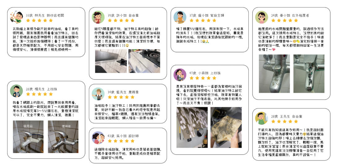 厚重黏膩的油汙、頑固頑強的水垢,可重複噴灑,靜置數分鐘後再擦拭,效果更佳。