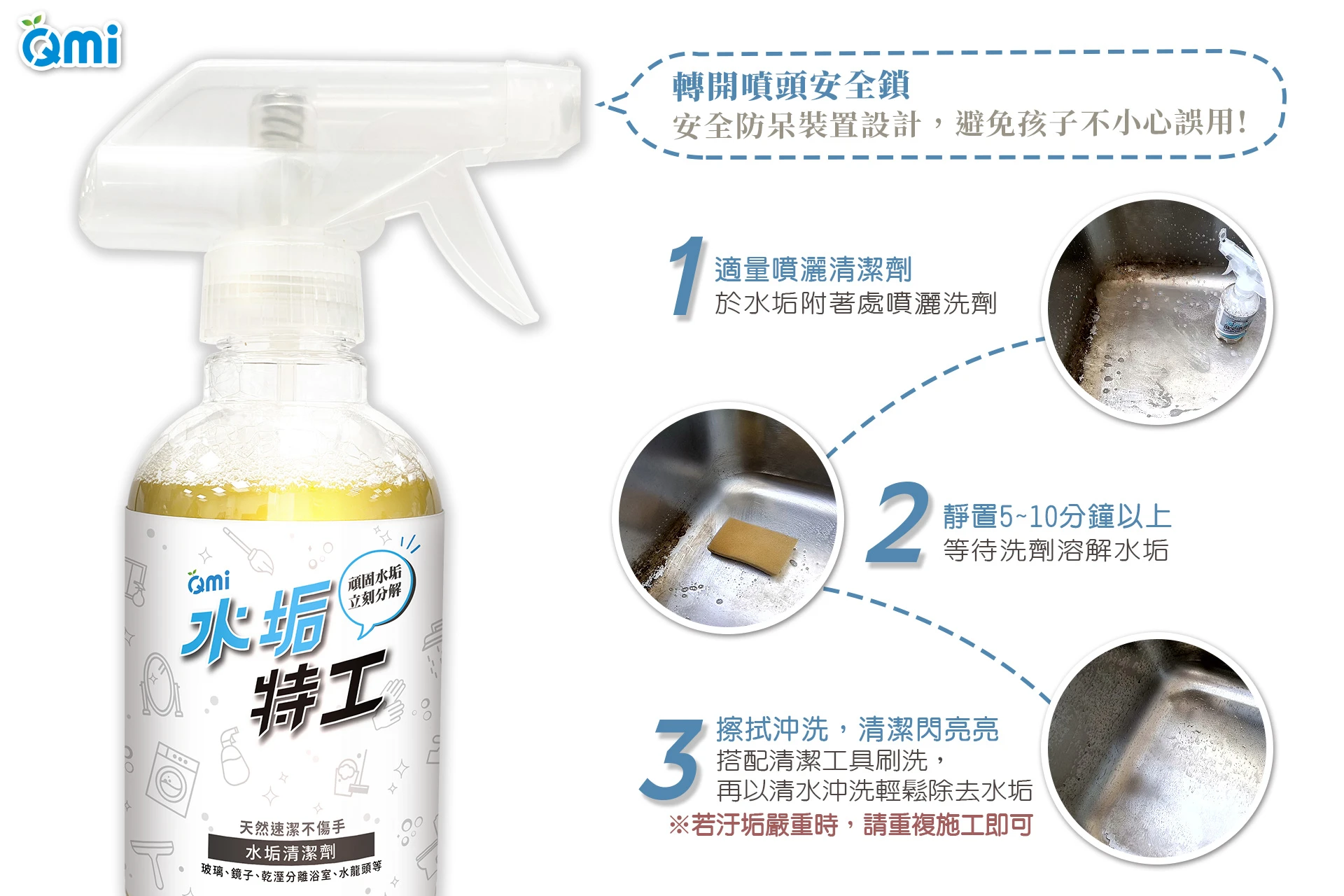 均勻噴灑於物品表面,靜待5-10分鐘,搭配清潔工具刷洗即可輕鬆去除水垢,水垢嚴重時請重複施作即可。