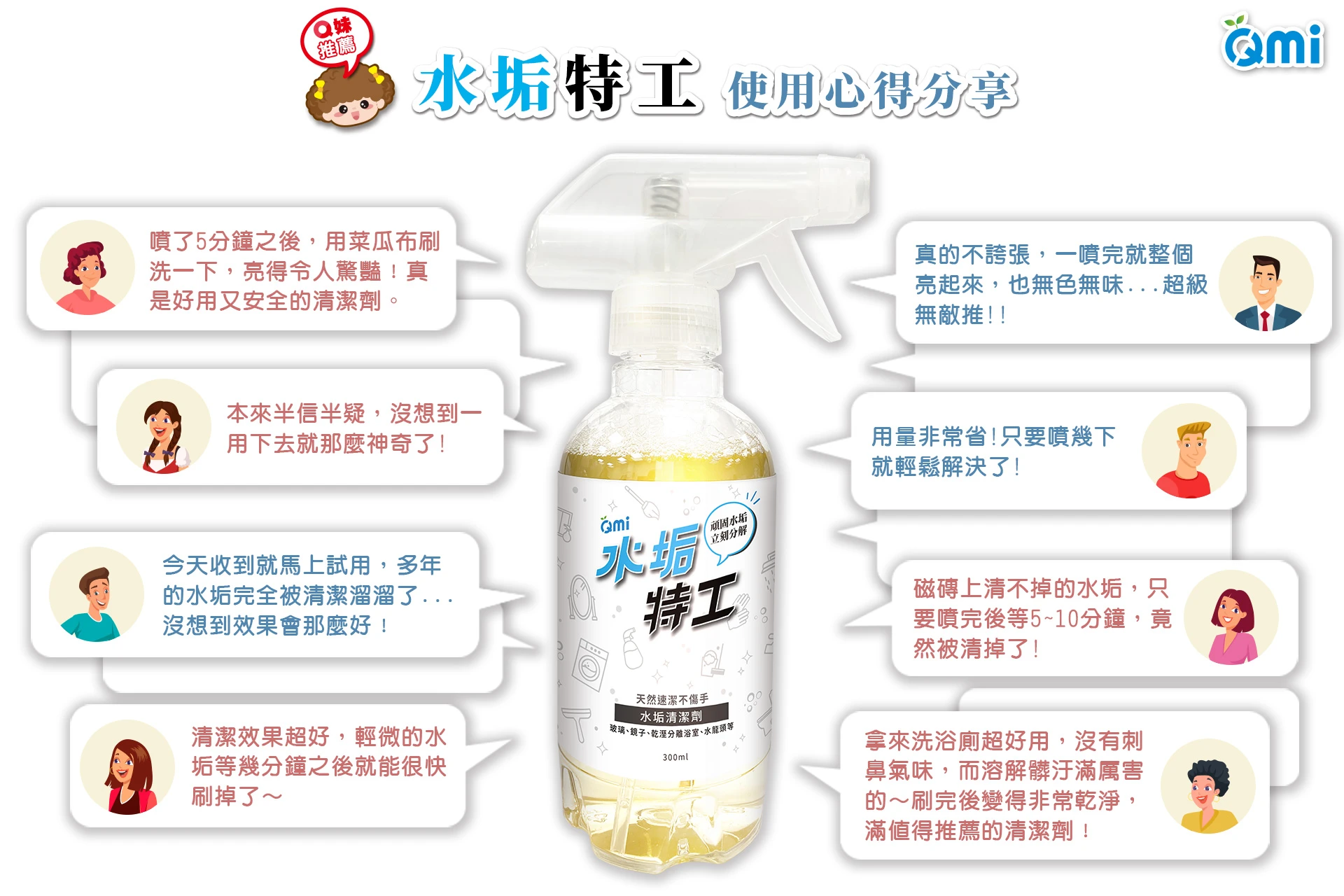 水垢特工顛覆你的想像,專用水垢清潔劑,噴灑後靜置5~10分鐘,輕輕一擦,迅速分解水垢,再加上專利鍍膜保護,讓玻璃不留水漬1~2週