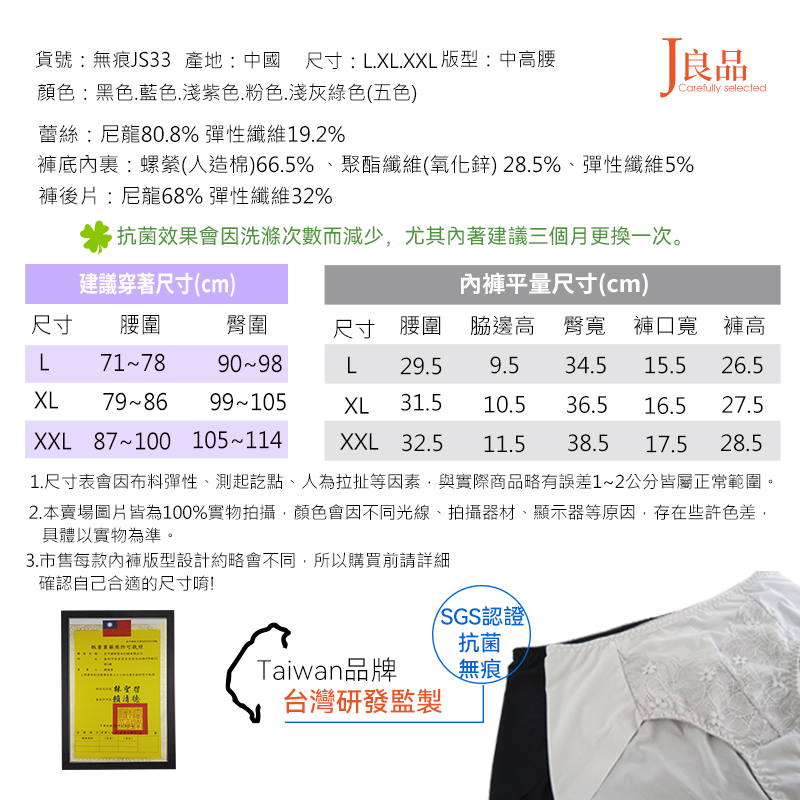 💖底褲添加抗菌鋅纖維,經 台灣SGS認證,金黃色葡萄球菌、白色念珠菌、大腸桿菌,滅菌率達99.99%. ☑.抗菌效果會因洗滌次數而減少,並且避免溫熱水洗滌內著唷!