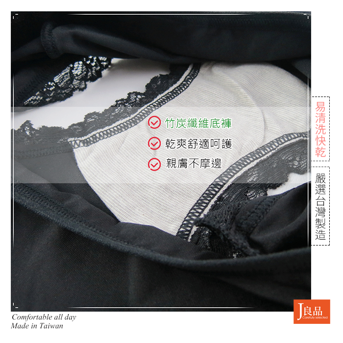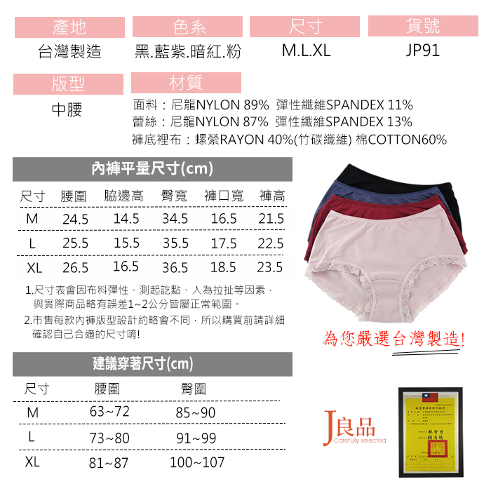 < 台灣製 蕾絲 親膚 透氣 質感 竹炭褲底 中腰 女 蕾絲內褲 JP91 >