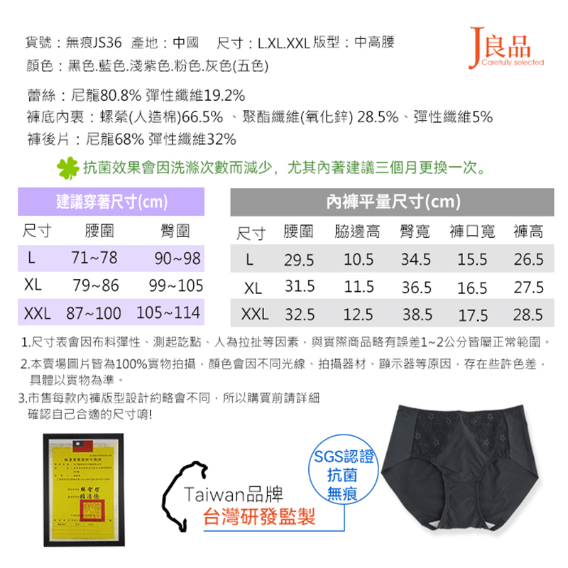 【真無痕抗菌女內褲 JS36】☑.尺寸L~XXL,五色,速乾不悶,無痕中高腰內褲。