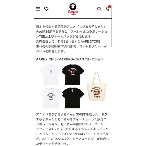 印有小丸子與野口同學圖案的限量版 T 恤與托特包,將於 11 月 2 日率先在 AAPE 心齋橋店發售,完整系列將自 11 月 20 日起陸續上市。