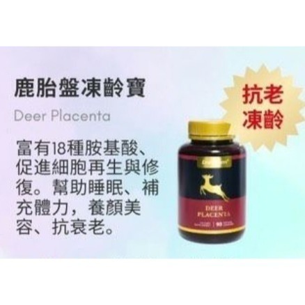 紐西蘭原裝進口,鹿胎盤凍齡寶,90粒裝,富有18種胺基酸,促進細胞再生與修復,幫助睡眠,補充體力,養顏美容,抗衰老。