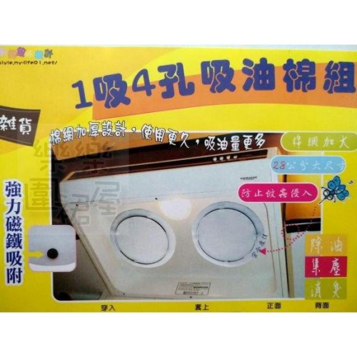購買前,請先確認您家中的抽油煙機要能吸附磁鐵才可使用喔!!! .品名: 【1吸4孔吸油棉組 1+6 抽油煙架組】 .數量: 鐵架1,油棉6 .材質:鐵線電鍍、磁鐵、聚酯棉 .規格:鐵架直徑22.5公分,濾油棉直徑約28公分 .產地:台灣 注意事項: ◇烹煮燒酒雞或大火快炒食材切忌不適用本產品(請先拆除本產品) ◇安裝本商品時,瓦斯盧與排油煙機上下距離不得低於1公尺。 ◇吸油棉如有黃漬污垢請適時更新。 ◇鐵架為電鍍品,如有脫漆生鏽,也建議適時更換新品。 ◇ 無法吸磁的金屬機台不適用,如正白鐵抽油煙機。 (請先確認您的抽油煙機可吸附磁鐵)
