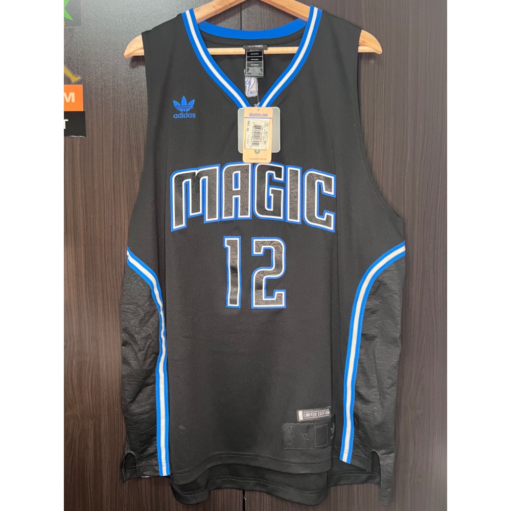 全黑配色搭配經典藍邊,最帥的細節在於號碼與側邊布料內藏有「特殊的籃球暗紋」。下擺帶有 Limited Edition 銀標,質感極佳。全新含吊牌 (BNWT),尺寸 XL,街頭穿搭神物,市面極稀有。