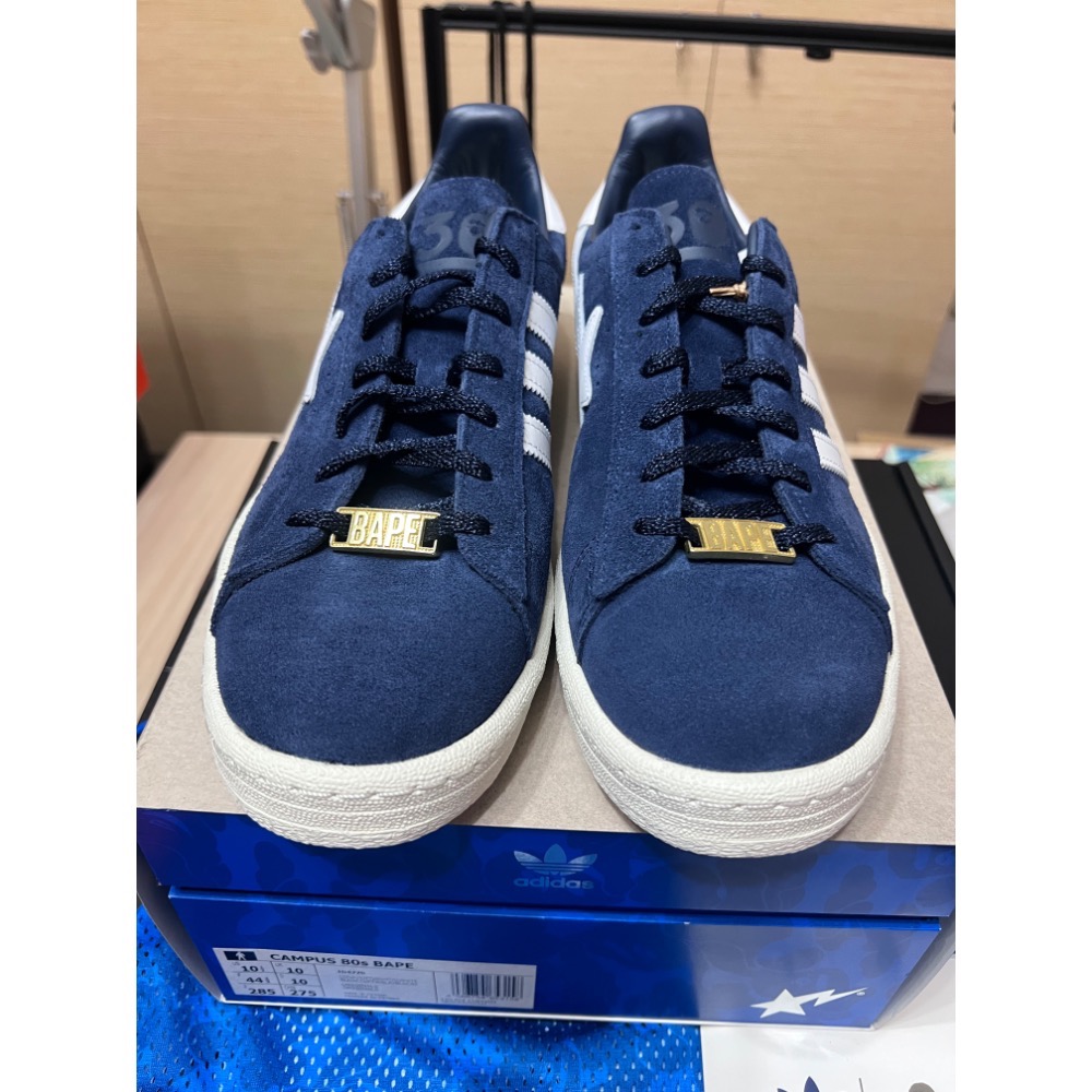 以經典 Campus 80s 為藍本,採用頂級海軍藍麂皮。最大亮點為「左右腳不對稱設計」,一邊是 Adidas 三線,一邊是 BAPE STA 流星標。鞋帶扣與後跟採用金色細節點綴,極具奢華感。US 10.5 (28.5cm) 黃金碼,全新全配含特殊迷彩盒,潮流玩家必收。