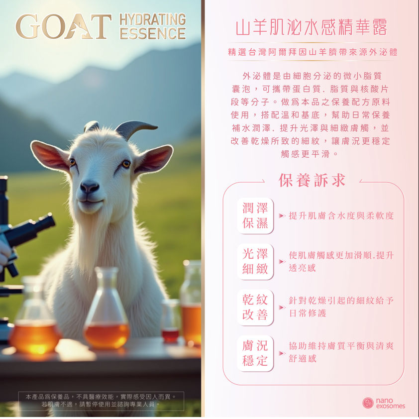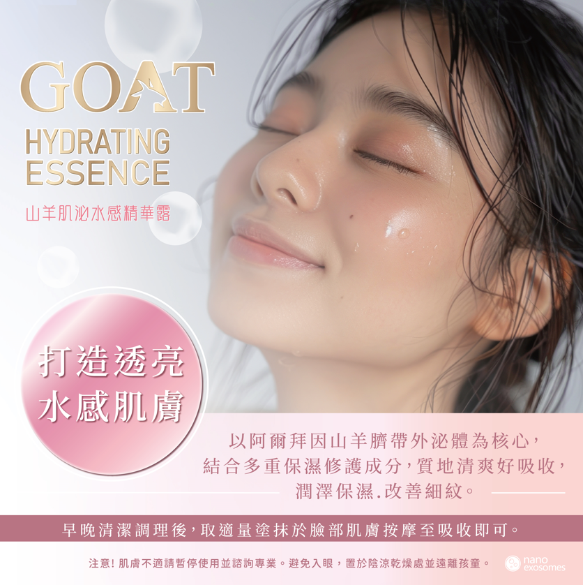 富含精純阿爾拜因山羊外泌體活膚成分及3大專利成分,賦予肌膚極佳的保濕與修護力,好吸收不黏膩,提升活膚柔嫩,強化肌膚屏障,帶來輕盈水潤與絕佳舒適感,尊寵呵護您的肌膚。
