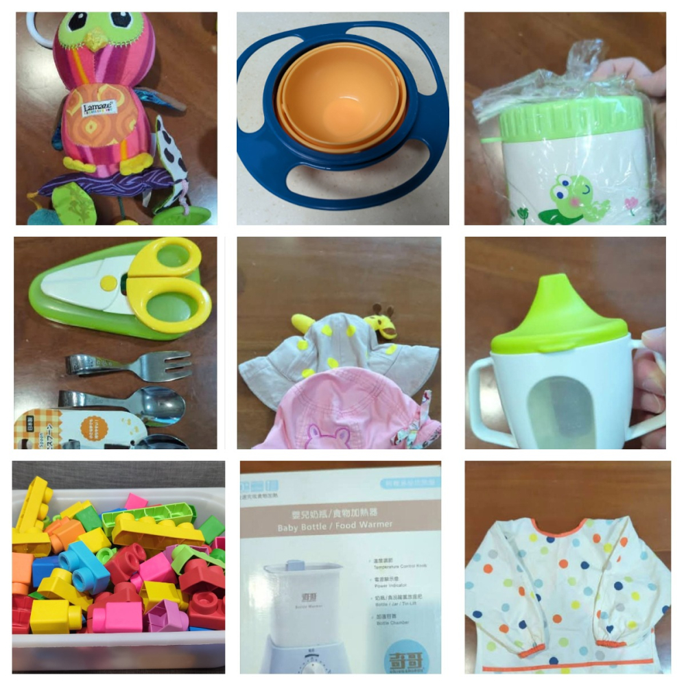 奇哥溫奶器、旋轉不傾覆碗、IKEA直飲水杯、帽帽、食物剪&兒童餐具、防汙衣、攜帶保溫盒、Lamaze貓頭鷹、軟積木