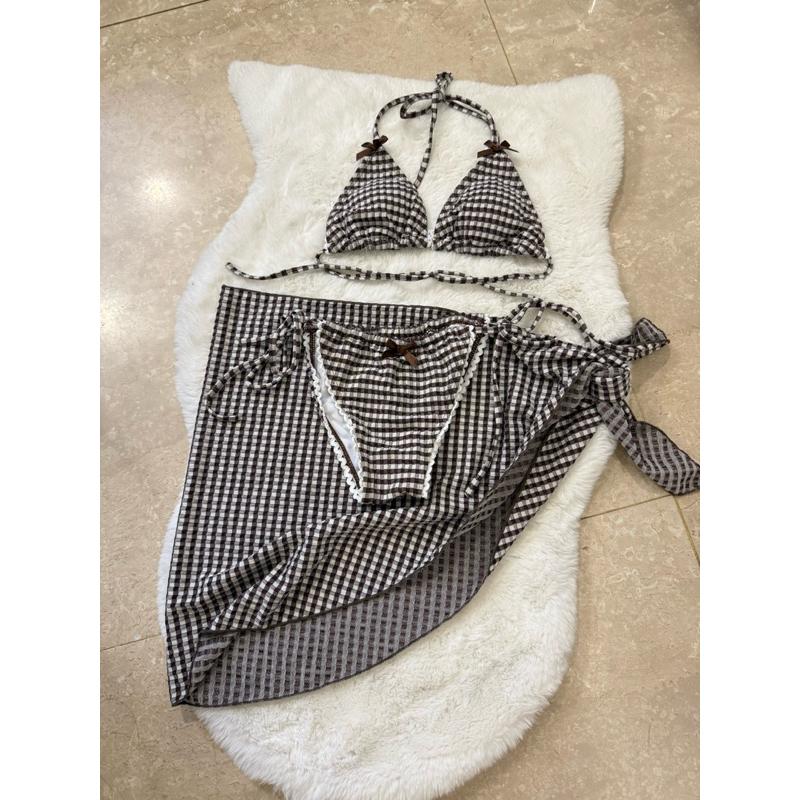 ✨ 甜美復古格紋三件式比基尼套裝 ✨ 海邊度假、泳池派對都超吸睛! ✔ 經典咖啡色小格紋,法式復古感滿分 ✔ 三件式設計:三角比基尼上衣 + 綁帶小褲 + 輕盈同花色沙龍裙,一套搞定 ✔ 上衣可調節肩頸與背部綁帶,舒適貼身 ✔ 褲口搭配小蕾絲滾邊與蝴蝶結點綴,甜美中帶點俏皮