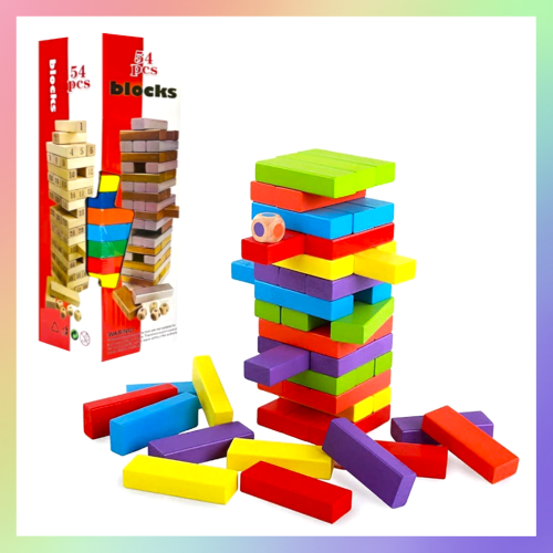 每層三塊交錯堆疊整齊,再由玩家輪流將下方的積木抽出堆疊到塔的最上層,