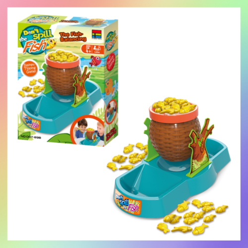 平分小魚後,輪流將小魚放上竹簍,誰先打翻就輸了