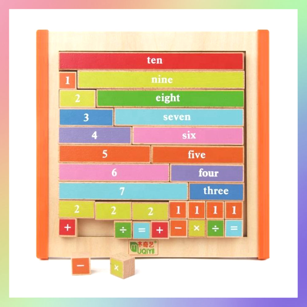 互動式學習工具,包含寫有數字和對應英文單字的彩色積木,