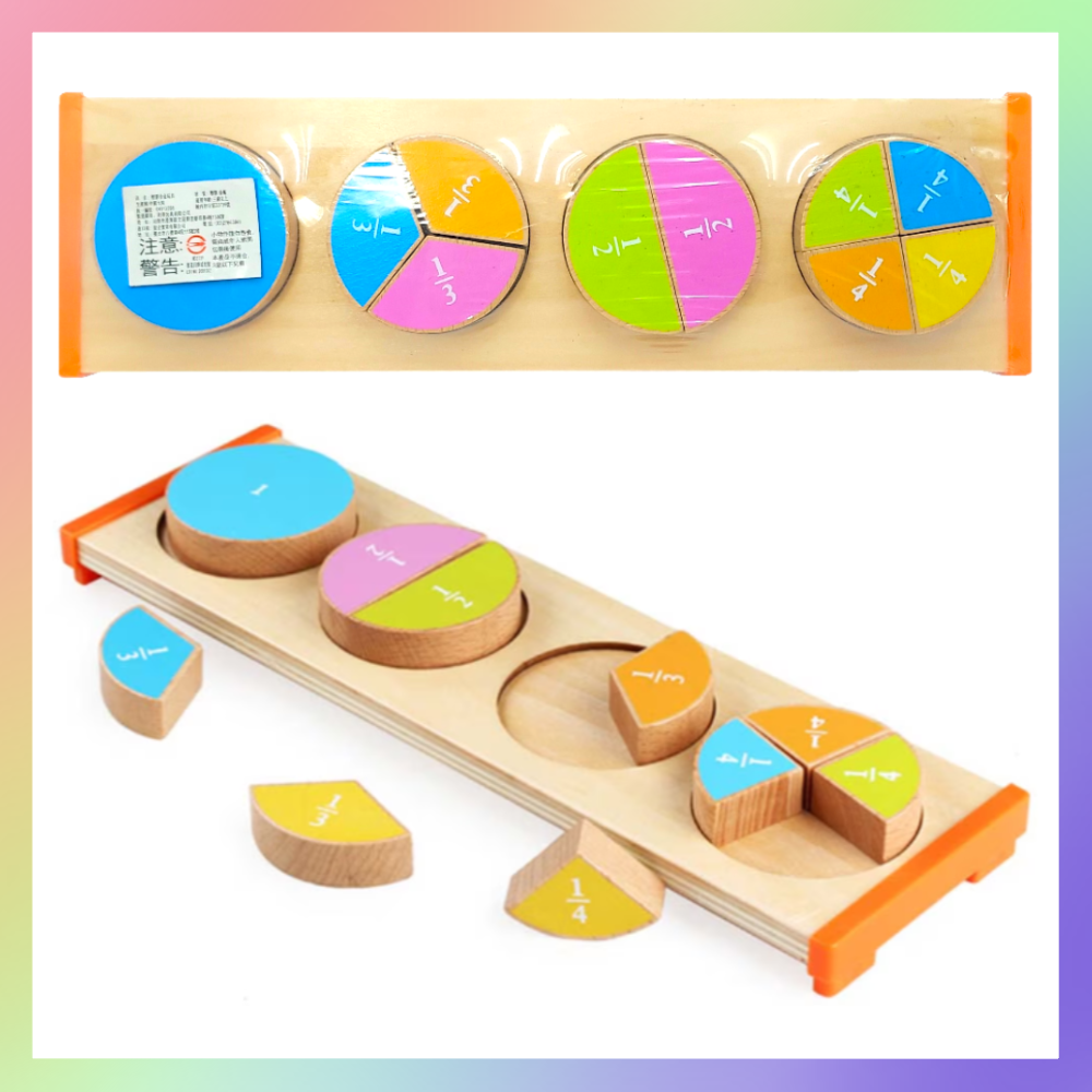 包含多種可拆卸的圓形分數塊,分別代表整體、1/2、1/3 和1/4 等不同分數。