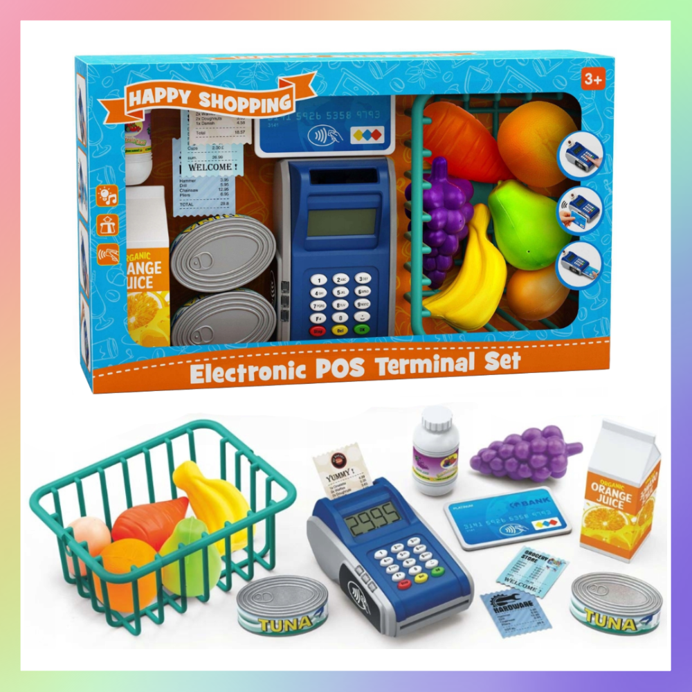 含豐富配件,如POS機、購物籃、模擬銀行卡、收據票據,以及多種仿真食物。