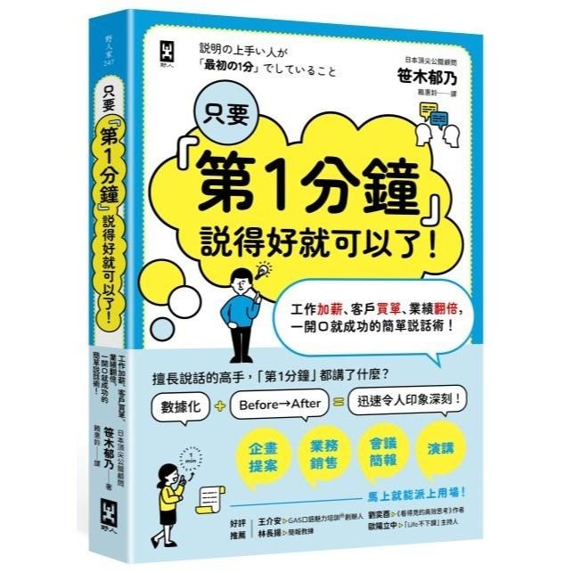 書中以真實案例、公式化步驟拆解「第1分鐘說明技巧」,帶你學會在最短時間內吸引聽眾、建立信任、贏得對話主導權。從銷售到開會、從簡報到面試,不論你是否善於表達,只要掌握這套「6步驟說話公式」,你會發現:不管開口談什麼,大家都聽得津津有味!