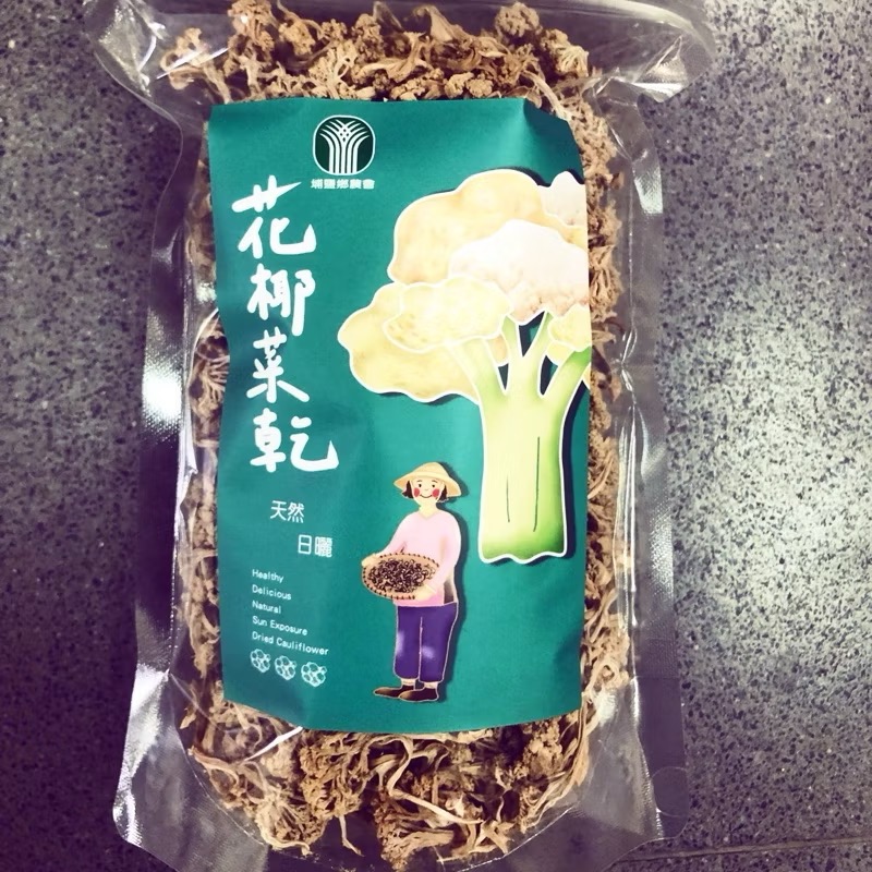 又稱阿嬤的私房菜,由新鮮花椰菜撕開經由日曬成乾,長時間日曬使花椰菜干香又脆,不管乾炒或煮湯都能嘗到香脆甘醇的滋味,是許多素食者的選擇,也是餐廳的押寶菜!