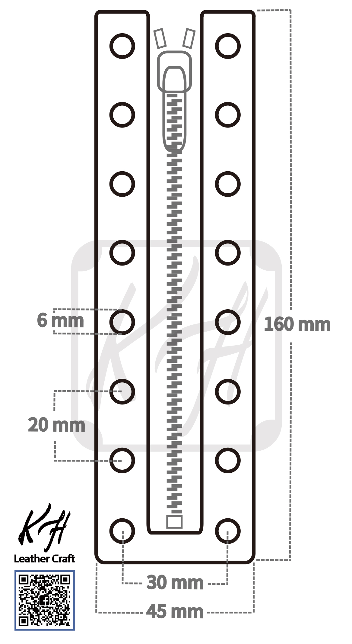 9. 拉鍊盤規格 : 長約 16 cm , 寬約 4.5 cm , 厚約 3 mm , 孔洞上下距離 2 cm ,孔洞左右距離 3 cm