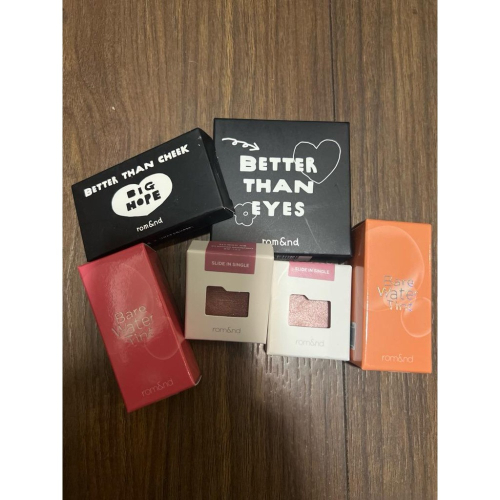 Rom&nd Better than eyes四格眼影盤02色Peony in black Better than cheek big hope腮紅B01色Ginger night Slide in single單色眼影S11色 mashed grapefruit Bare water tint唇釉 03色Nutty move/04色 Water grape