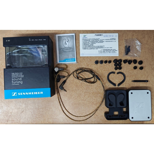 IE80 耳機、防潮便攜盒(外表有些許磨損)、耳掛、線夾、耳道墊圈數個、聲音調整及清潔工具