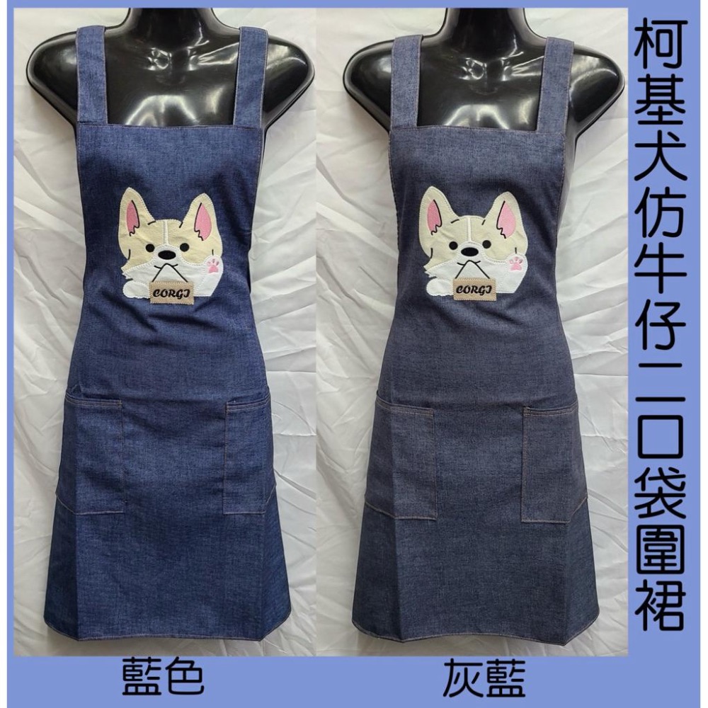 ♥️批發小姐[台灣製造] F5046柯基犬仿牛仔二口袋圍裙 生意營業工作用圍裙