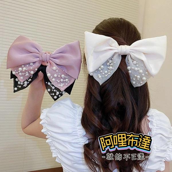 【阿哩布達】👉【髮飾】台灣現貨 快速出貨DFJ07 抖音熱門 甜美風 超大蕾絲蝴蝶結珍珠髮夾 大髮夾 彈簧夾 新娘飾品