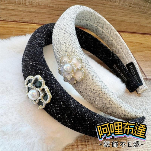 【阿哩布達】👉【髮飾】台灣現貨 快速出貨K18 美麗新娘 高雅小香風山茶花寬版髮箍 頭飾 黑白兩色可選 新秘 新娘飾品