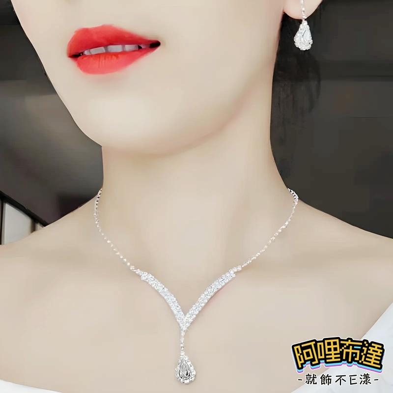 【阿哩布達】👉【套鍊組】台灣現貨 快速出貨TL25 美麗新娘 璀璨華麗V字水滴水鑽項鍊耳環套組 二件組 新秘 新娘項鍊