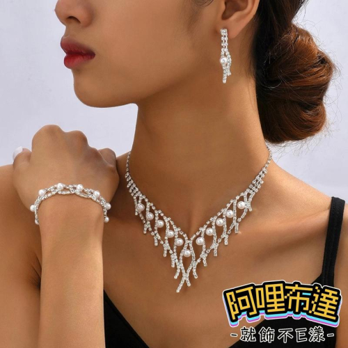 【阿哩布達】👉【套鍊組】台灣現貨 快速出貨TL09 美麗新娘 珍珠水鑽鏤空V型項鍊手鍊耳針套組 耳夾套組 三件組