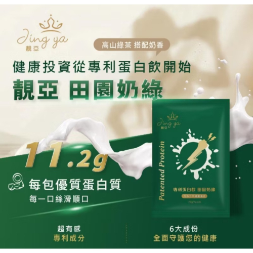 成份:大豆蛋白、脫鹽乳清粉、膠原蛋白、奶粉、分離乳清蛋白、香料粉(乳糖、香料)、綠茶粉、小麥苗粉、綜合維生素(乳糖、麥芽糊精、 維生素C、維生素E、辛烯基丁二酸鈉澱粉、維生素B6、維生素B2、菸鹼醯胺、維生素B1、維生素A、阿拉伯膠、玉米澱粉、本多酸鈣、維生素D3、庶糖、抗壞血酸鈉、中鏈三酸甘油酯、 維生素B12、檸檬酸鈉、檸檬酸、葉酸、生物素)、三仙膠、海藻鈣、蔗糖素(甜味劑)