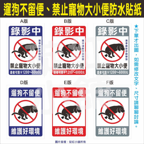 材質:PVC貼紙-上膜-防水 室內、室外 可貼於玻璃、牆壁...等 ---------------------------------------------------------------------- 訂單滿100元才會出貨(不含運費) 如造成不便,敬請見諒! ------------------------------------------------------------------------ 尺寸:A4(21X30CM)    A3(42X30CM) 其它尺寸皆可客製,歡迎聊聊 貼之前請先將黏貼處擦拭乾淨 如怕有氣泡,可用噴水瓶加一點點洗碗精 噴濕貼紙,貼上後將水刮出即可服貼 其它尺寸可客製,可以聊聊報價 ------------------------------------------------------------------------出貨---------------------------------------------------------------------- 下單後出圖(如果現貨會當天出貨),平日2-3天出貨,遇例日順延 ★店到店基本三天到貨,如遇節日貨量大,到貨日可能順延 ★急件者可選郵局(正常是寄出後隔日到貨,偏遠地區不一定) (適用週一至週三下單者)         (星期四之後下單者勿選郵局,不會比店到店快)  郵資80元,多不退少不補  下單每人不同,無法一一確認郵資,介意者勿選郵局 #遛狗不留便 #禁止寵物大小便 #防水貼紙 #貼紙 #PVC貼紙 #可客製