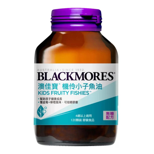 幫助孩子健康成長。 覆盆莓+柳橙風味,可咀嚼膠囊。 品名 : 澳佳寶機伶小子濃縮魚油膠囊食品 120粒 內容量/入數 : 120粒 成分 : 濃縮魚油、明膠、 D-木糖醇(甜味劑)、大豆油、甘油、蜂蠟、可可脂、純水、D-山梨醇液70%(甜味劑)、天然香料、維生素E、檸檬酸、羥丙基甲基纖維素、混合濃縮生育醇(抗氧化劑)、氧化鐵。本產品含魚製品。 定期汞含量及戴奧辛檢測 劑型 : 膠囊 產地 : 紐西蘭 使用方式 : 4歲以上每天1顆,請於飯後咀嚼食用,切勿整顆吞嚥。無咀嚼能力之幼童,可刺破擠出,混入飲料中服用。請務必在成人監督下食用,避免兒童自行拿取。 保存方式 : 建議存放於25°C以下乾燥處, 開封後請冷藏。 製造/進口商名稱 : 台灣百麗康美股份有限公司 製造/進口商地址 : 台北市信義區信義路四段456號26樓 製造/進口商電話 : 02-23450138 注意事項 : 4歲以上每天1顆,請於飯後咀嚼食用,切勿整顆吞嚥。無咀嚼能力之幼童,可刺破擠出,混入飲料中服用。請務必在成人監督下食用,避免兒童自行拿取。 產品責任險契約字號 : 富邦產物保險0500字第25AML0000380號 食品業登錄字號 : A-127765106-00000-2 過敏原資訊 : 本產品含有魚類製品,過敏者請留意。 品牌 : BLACKMORES 澳佳寶
