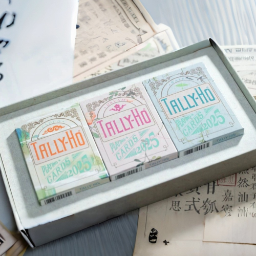 飛花令,是紙牌,也是古人的浪漫“飛花令” 原為文人間以詩會友、以令鬥才的風雅遊戲,今借其意,將牌為 “令” ,以圖作詩。Tally-Ho 提取古典意象,化用山水、煙雲、雨意等東方元素,在撲克牌中構築出寫意與留白的視覺空間。每一副牌盒如書卷開啟,牌面墨痕似書法流轉,背面圖案保留 Tally-Ho 的經典扇背/圓背框架,在光影中翻飛,既有傳統的靈魂,也具現代的演繹。
