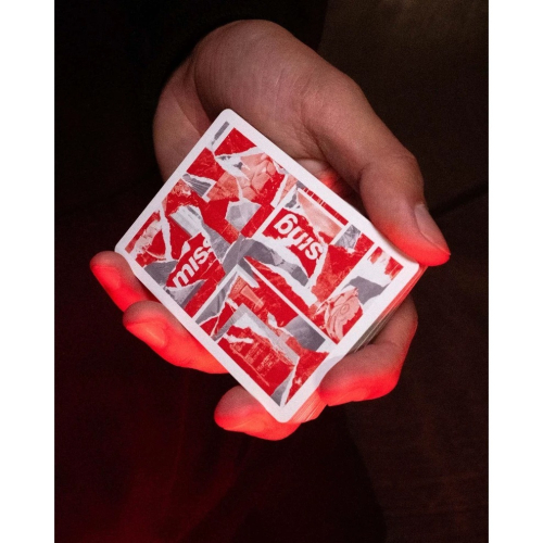經典 Collage 的黑白灰被熾烈的紅色重構,牌背的拼貼紋理在紅灰碰撞中更具張力。