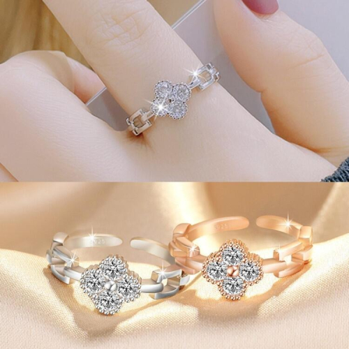 韓版四葉草微鑲鋯石戒指 開口可調節戒指 時尚簡約戒指鏤空指環 玫瑰金戒指 韓國甜美小清新飾品 幸運草戒指 水鑽戒指食指戒
