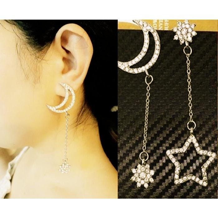 星月耳環 韓版精緻耳飾 星星月亮耳環 長款耳環 鏈條耳環 不對稱流蘇耳環 水鑽耳環 鏤空星星耳環 韓國飾品 垂墜耳環耳墜