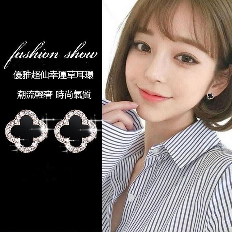 四葉草耳環 幸運草耳環 韓國時尚耳環 小清新甜美耳飾 黑色耳環 超仙氣質飾品 花朵耳環 簡約耳釘 微鑲水鑽耳環 鋯石耳環