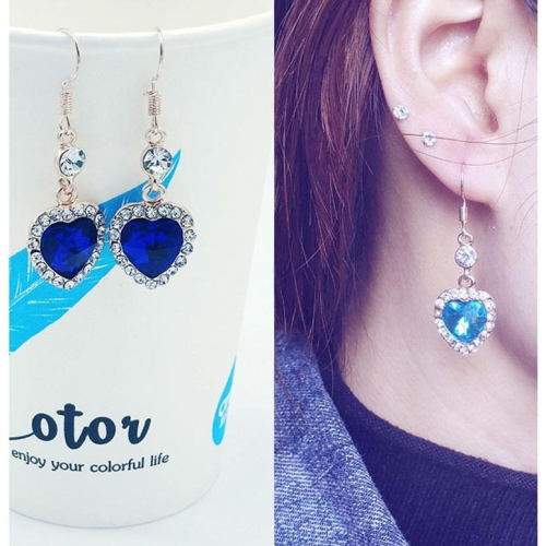 時尚OL淑女飾品 滿鑽愛心耳環 海洋之心耳環 水晶耳環 耳墜 鋯石耳環 藍色寶石耳環 垂墜後掛式耳環 水鑽耳環 吊墜耳環