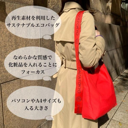 Shiseido 資生堂 Ginza Tokyo山茶花環保購物袋 尺寸(約):30cm x 25 x 9.5 cm 一款採用環保可持續材料製成的環保袋,設計俏皮。 資生堂以創造美麗的地球環境為目標,推出了使用再生聚酯材料的環保袋。以品牌紅色為基礎,採用俏皮設計,絲帶肩部飾有山茶花標記和標誌。一款集便利性和折疊後可攜帶的設計於一體的化妝包。 材質:滌綸 ※圖片是形象。因為是軟質材料,可以折疊緊湊,所以不會自立,會以折疊狀態發貨