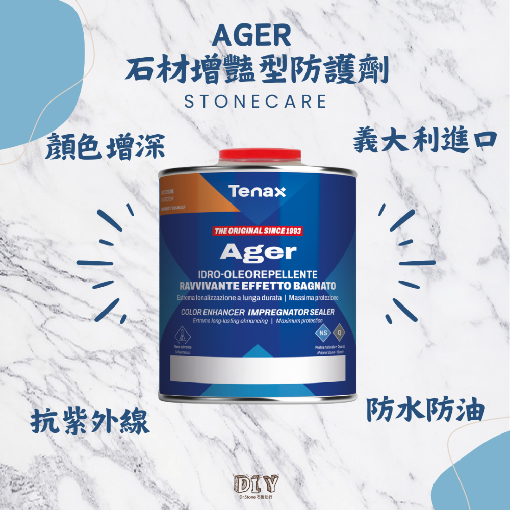 AGER石材濕色防護劑為增強和恢復石材的顏色和天然紋理,不僅僅如此,它還可防止水及油污滲入石材內部,提供了石材表面防護層。此產品為強效型防護劑,高滲透性及高防護性並帶有原廠認證之抗塗鴉及抗紫外線UV之功效,讓其立為石材防護劑的頂端。