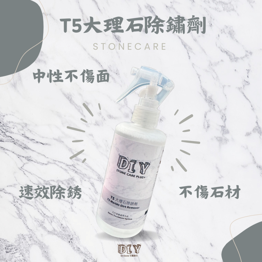 石材(尤其是花崗岩、大理石、抿石子)含有微量鐵質或因外部鐵件(欄杆、螺絲、雨水帶入鐵銹)滲入表層孔隙,長時間接觸水分與氧氣後,會形成 氧化鐵(鐵鏽),造成黃褐色或紅色斑痕。T5大理石速效除銹劑,是一種含有活性劑成分的除銹劑,中性不傷表面,可清除大理石上的銹漬及金屬化物,不損害大理石光澤亮面。能使用在任何種類的大理石上,本產品滲入後與鐵鏽反應呈現紫色狀態即表示鐵鏽正在氧化,對光面石材無副作用,牆面及地面均可有效處理。本品也可使用在其他石材種類表面。