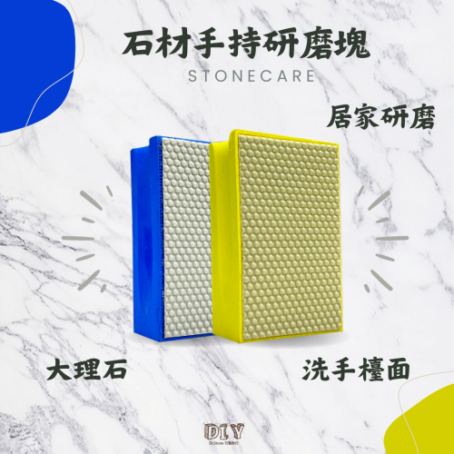 居家專用手持研磨塊,無須機器即可將您的大理石回歸光亮表面,去除水垢皂垢並增加觀賞性。主要分為4個番號,1號是粗(黃色),2號是細(藍色),3號跟4號則是拋光片,粗番針對較嚴重之酸蝕皂垢表面,或是刮痕較深之表面。細番用於輕微之酸蝕皂垢表面,使用完後,請接續使用3號以及4號拋光片拋光石材表面,使用完後可去除石材受損之表面。