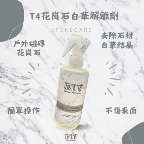 T4花崗石白華解離劑是一種酸性清潔劑。它具有良好的氧化性能,能於一般室溫下使用。藥水滲進石材毛細孔後能清除石灰岩質或其他礦物質汙漬,並不會在石材中殘留任何色素雜質,也不會傷害原本石材表面和光澤度。