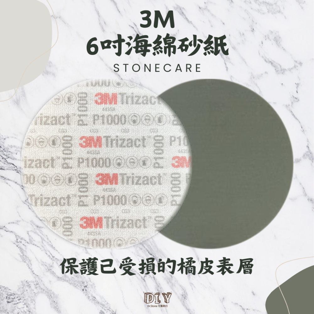 6吋海綿砂紙 Trizact-Blending-DISC鑽石結構P1000:混合式的泡沫砂紙設計可保護已受損的橘皮表層,讓施工後的漆面有更好的結構質地,建議噴濕使用,以延長該砂紙使用壽命。
