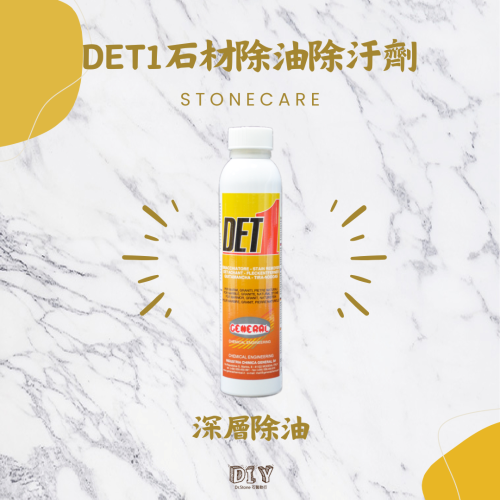 使用前先將DET1除油劑大力均勻搖晃,將非石材類的物件保護周全,再塗抹於受汙染表面,並置於至少半天。如遇較深層的污染可重複使用,直到污漬徹底清除。如欲去除乾燥後的除油劑可直接使用濕抹布將其擦拭即可。