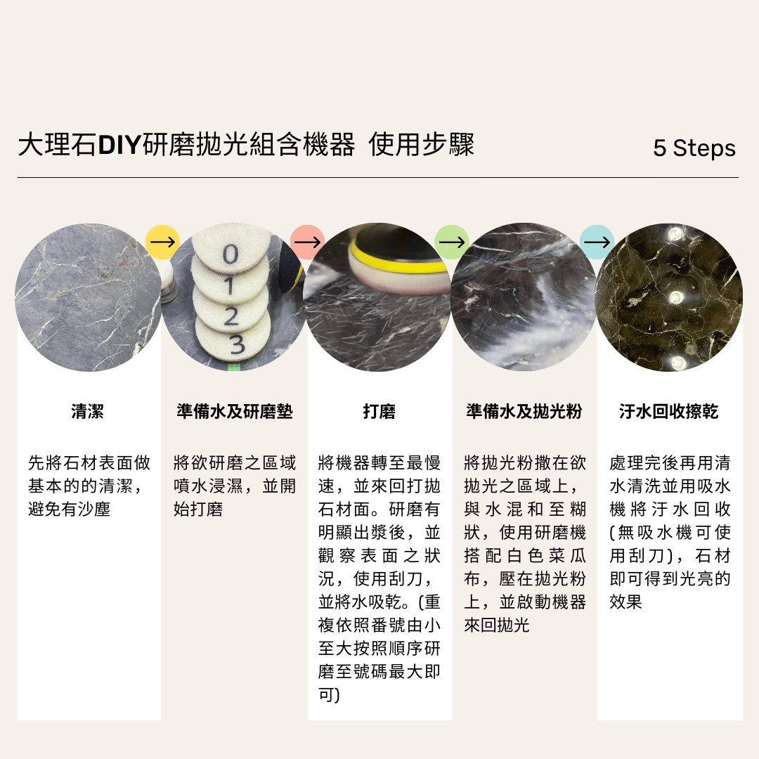 石材拋光機+石材研磨墊1組+大理石拋光粉+白色菜瓜布,最優質的研磨拋光組合