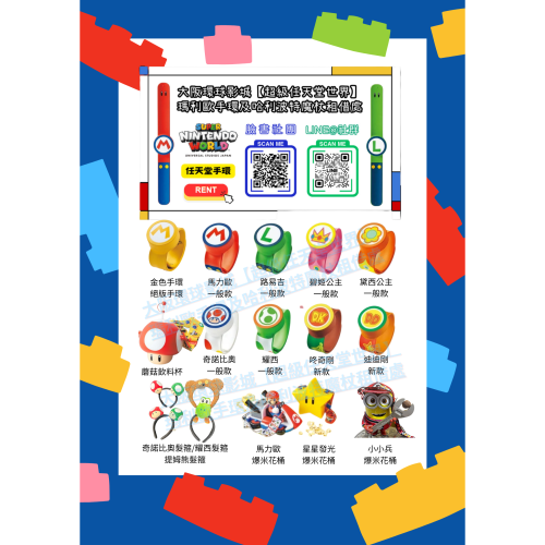 品項租金說明⭐️ 隨機盲包手環$120七天內,不挑款💖 指定款六角色$150馬力歐 / 路易吉 / 耀西 / 奇諾比奧 / 碧姬 / 黛西👑 金色絕版馬力歐/咚奇剛/迪迪剛$250收藏級!🪄 互動魔杖$250(搭手環) / 單租 $300哈利波特園區必備!🍿 星星爆米花桶$300打卡超吸睛🎀 髮箍(奇諾比奧 / 耀西 / 提姆熊)各 $100一秒變主角✨